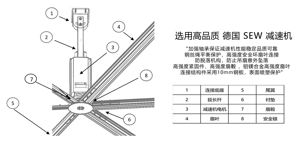 Apogee 減速機(jī)采用德國(guó)SEW減速一體機(jī),SKF加強(qiáng)型軸承,進(jìn)口雙油封,低噪音,可靠性高,相比感應(yīng)電機(jī)吊扇,重量減少25KG±,技術(shù)成熟產(chǎn)品,廣受市場(chǎng)好評(píng)。