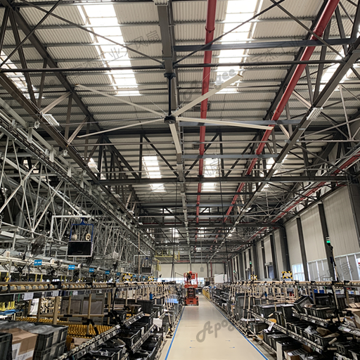 原有小風(fēng)扇無法解決問題,工廠原以為有了行車不能安裝吊扇,車間的通風(fēng)降溫一直是困擾工廠管理層的問題。 奧寶杰通過現(xiàn)場實地了解情況,結(jié)合廠房面積,設(shè)備布局, 人員分布情況, 在300*100米廠房里優(yōu)化布局48臺奧寶杰DM-7300 永磁工業(yè)吊扇。